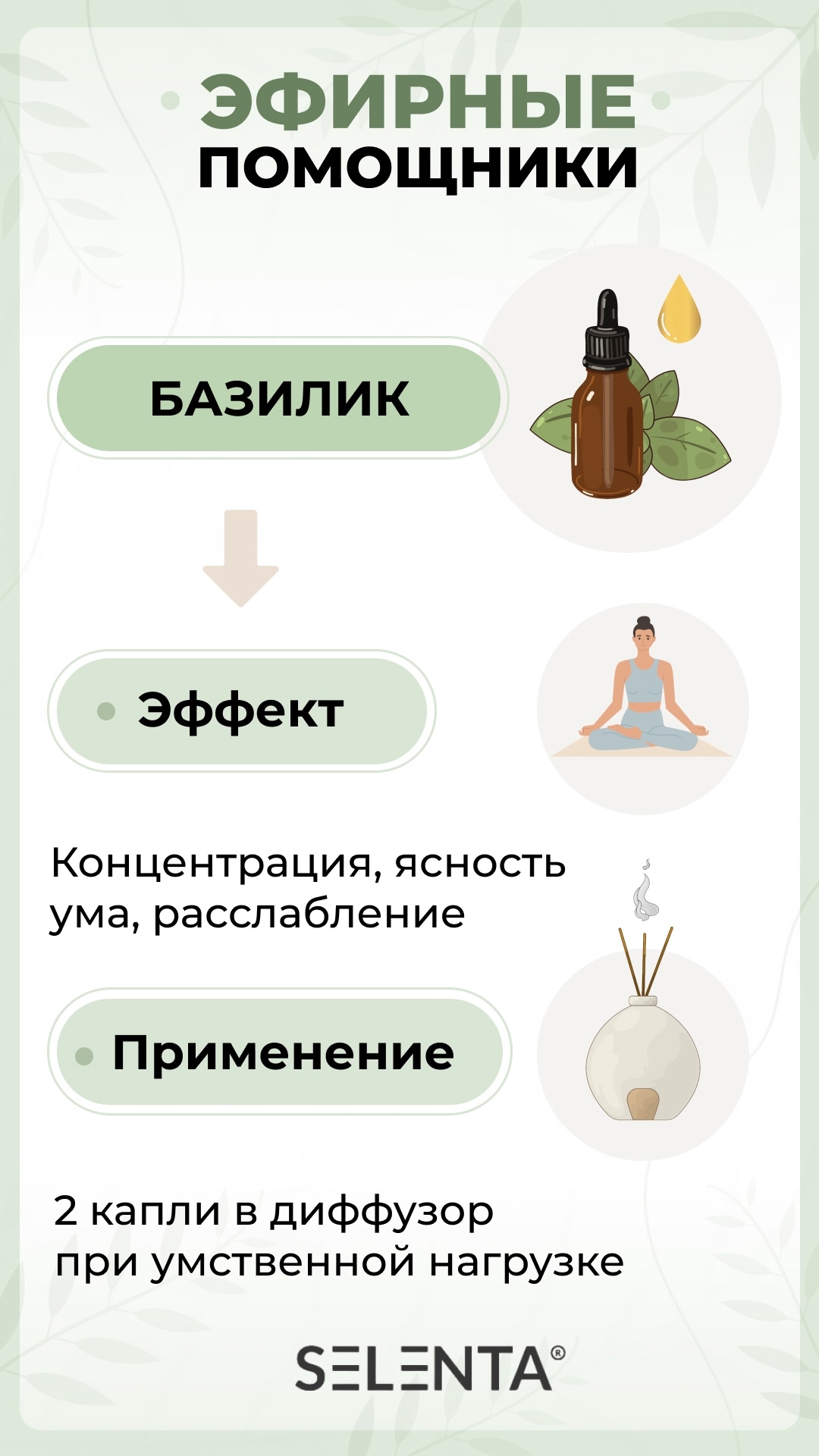 Эфирное мало Базилика — именно оно удостоено названия «королевское». Аромат не ассоциируется с одноименной травой. Запах разнообразный, терпкий и насыщенный, сладковатый с древесными нотками, напоминает луговое разнотравье. Обладает противовоспалительными, противовирусными и противогрибковыми, спазмолитическими свойствами. Является афродизиаком, антибактериальным и антиоксидантным средством. Используется базиликовое масло для нормализации кроветворения, снятия воспалений при ушибах, укусах и растяжениях. Имеет ярко выраженный охлаждающий и успокаивающий эффект. Показано больным с астмой, сердечными недугами, пониженным артериальным давлением. В ароматерапии применяется для восстановления обоняния после респираторных заболеваний. Косметологи используют эфир базилика для борьбы с акне и повышенной выработкой себума, в омолаживающих программах.