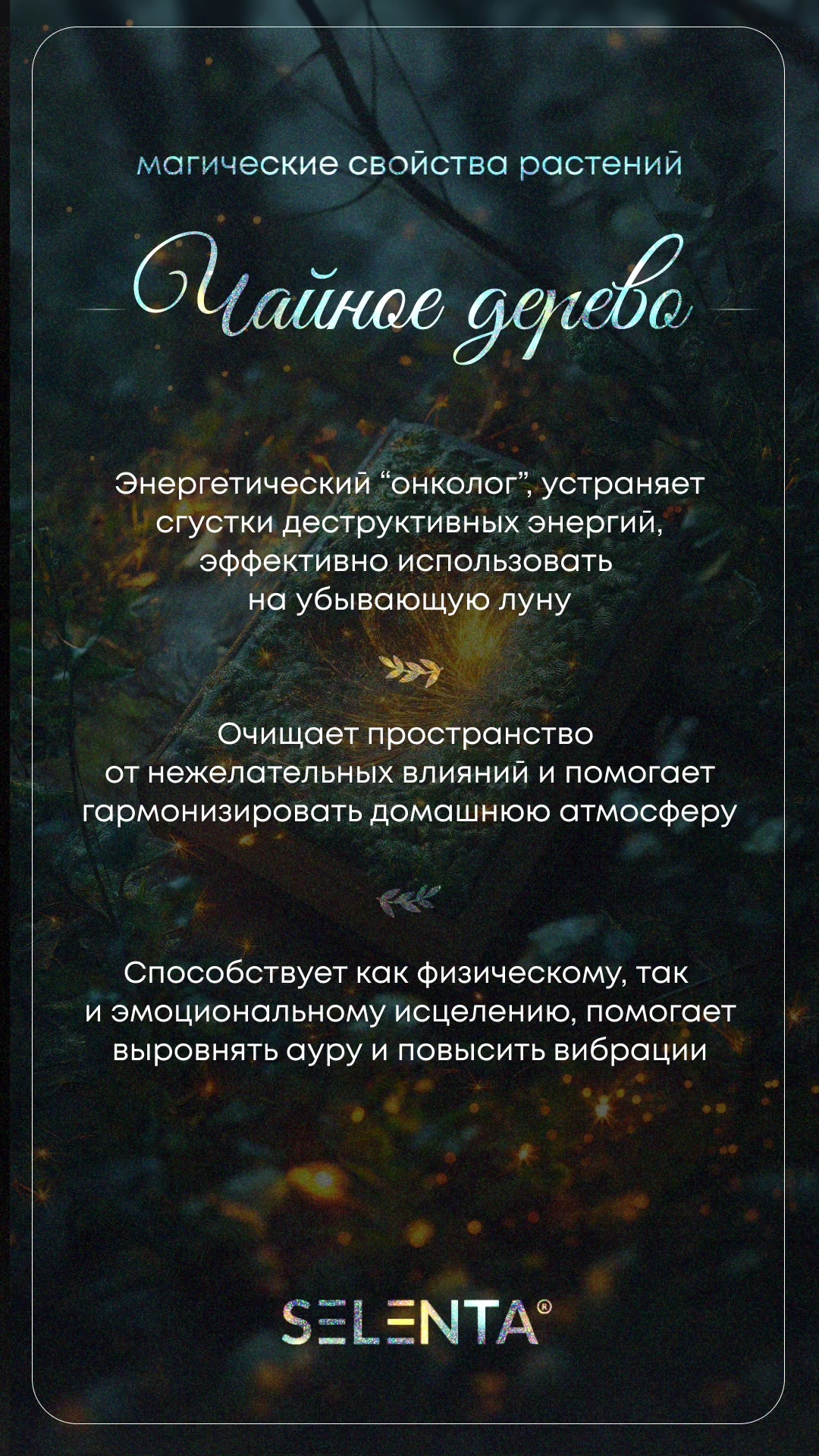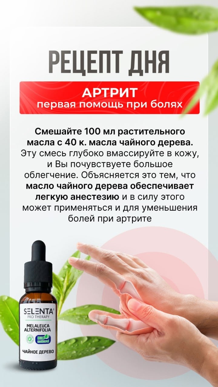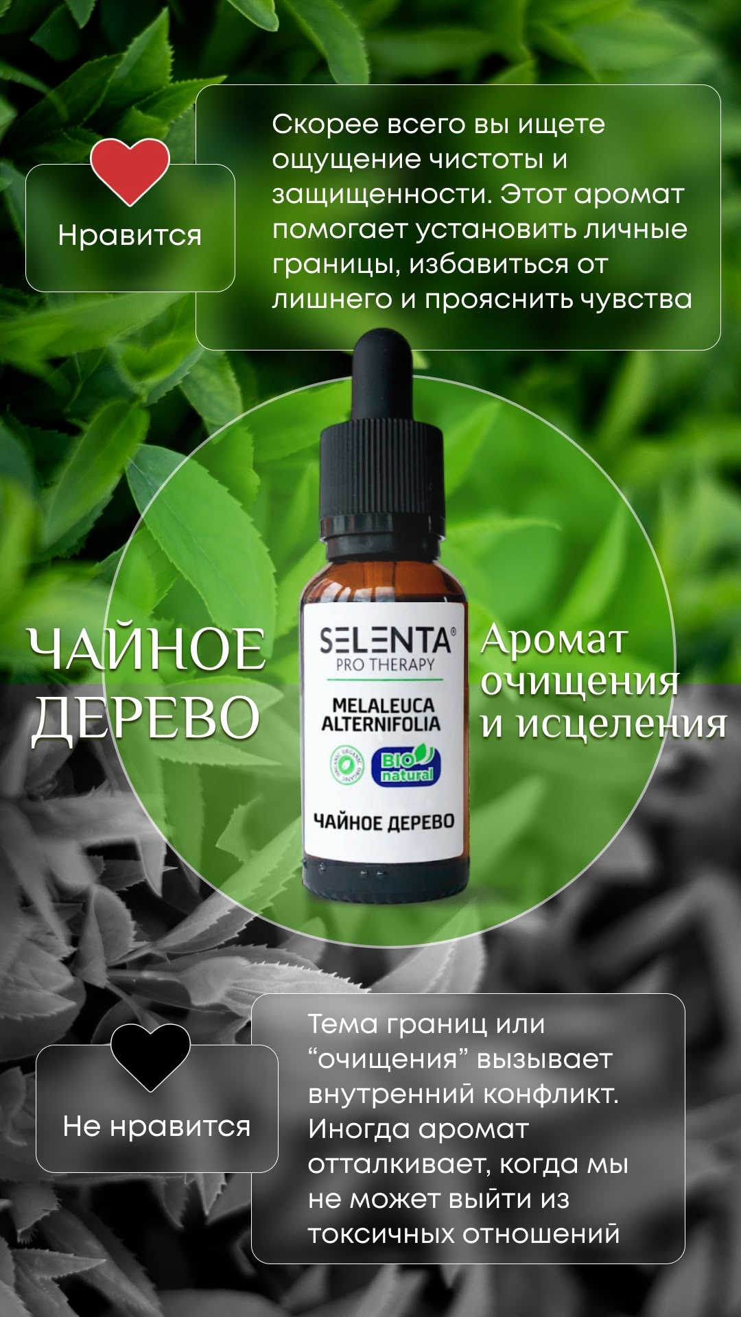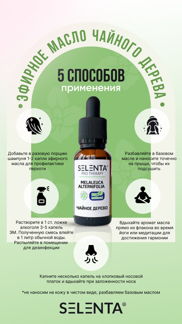 Эфирное масло Чайного Дерева — природный антисептик. Им обогащают средства по уходу за кожей лица и полостью рта, интимной гигиены. Чайное дерево обладает разнозаживляющими, бактерицидными, успокаивающими, обеззараживающими, противогрибковыми, противовирусными, антисептическими, иммуностимулирующими свойствами. В дерматологии и косметологии используется его способность снимать воспаления и раздражения, устранять сухость и активизировать собственные регенерирующие свойства кожи. Применяют масло чайного дерева при: повышенном потоотделении, поражениях кожного покрова, укусах насекомых, зуде и отечности различного происхождения, грибке ногтей, вирусных и инфекционных заболеваниях, гнойных ранах, гангрене, экземе, паразитарных дерматитах, новообразованиях, перхоти, выпадении волос, астме, герпесе, чесотке, ожогах, растяжениях, морской болезни.