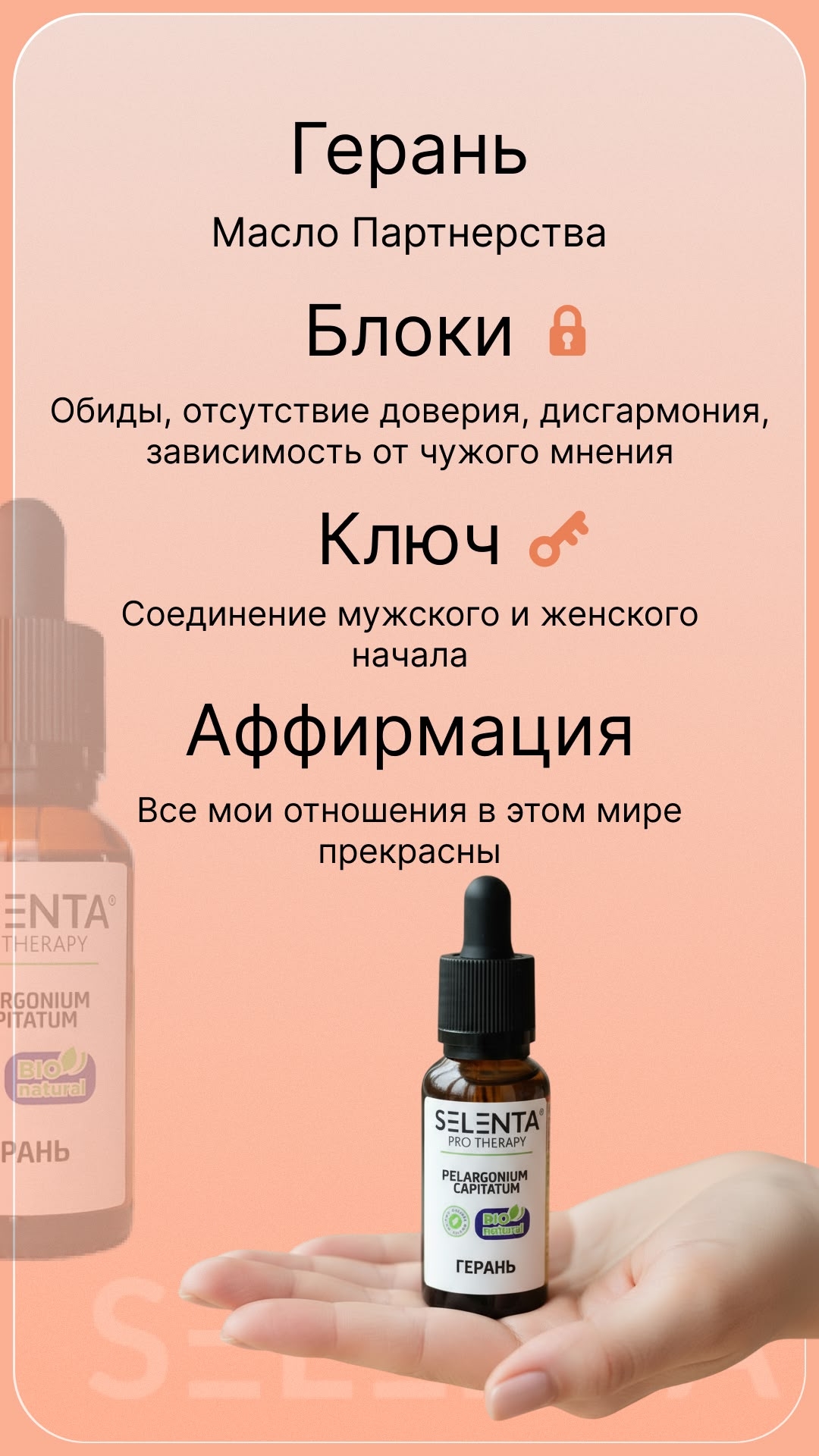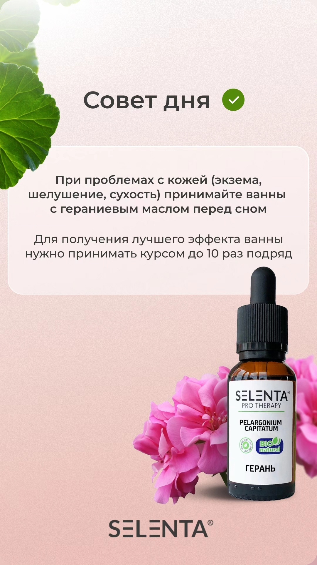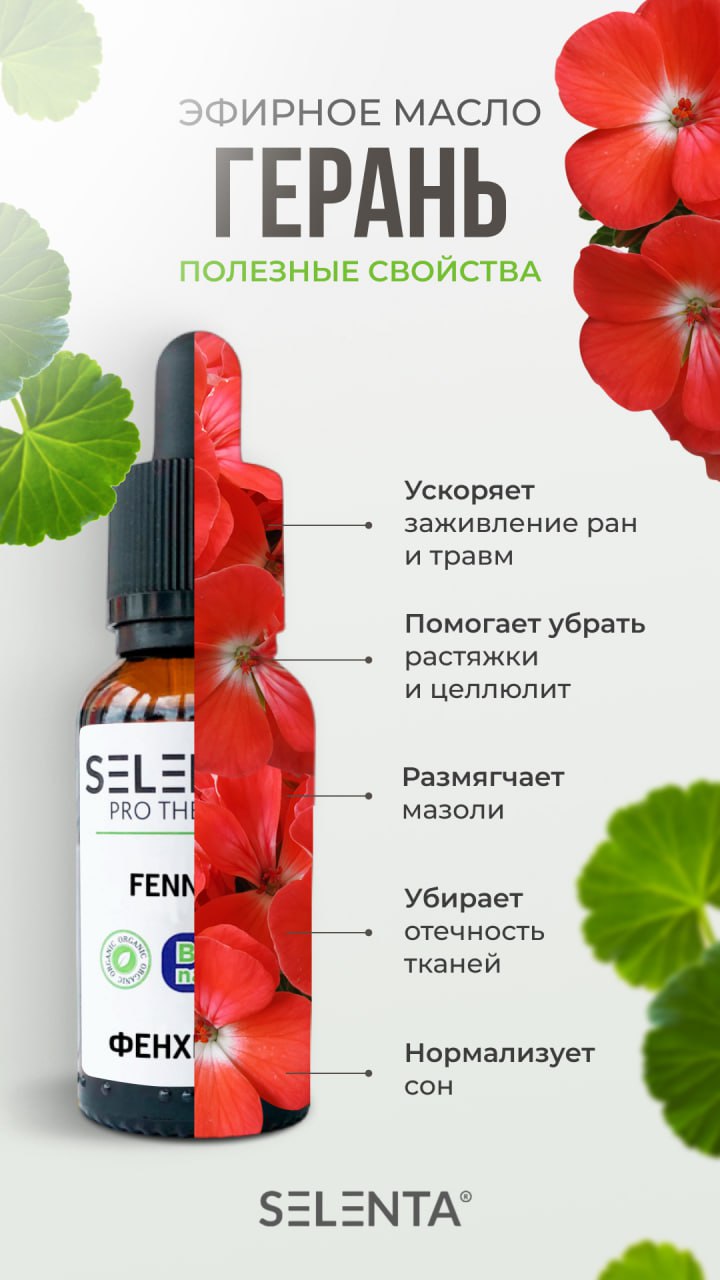 Эфирное масло Герани — одно из лучших природных средств для выравнивания гормонального фона. Помогает успокоиться, справиться с затяжной депрессией и нарушениями сна. Обладает оздоравливающими, освежающими, антисептическими, разнозаживляющими, обеззараживающими, регенерирующими, антицеллюлитными, противоотечными свойствами. Маслом Герани лечат волосы и придают им шелковистый блеск. Рекомендовано при лечении и профилактике дерматитов, экземы, заболеваний полости рта и десен, угревой сыпи, нейродермите, диатезе, идиосинкразии, педикулезе, герпесе, ожогах, обморожениях. В косметологии используются разглаживающие и увлажняющие свойства масла герани. Эфир применяется при лечении анке и постакне, для выработки коллагена, устранения воспалений различного характера, омоложения кожи, сглаживания рубцов и уменьшения выраженности стрий. С заботой о вашем здоровье, Selenta!