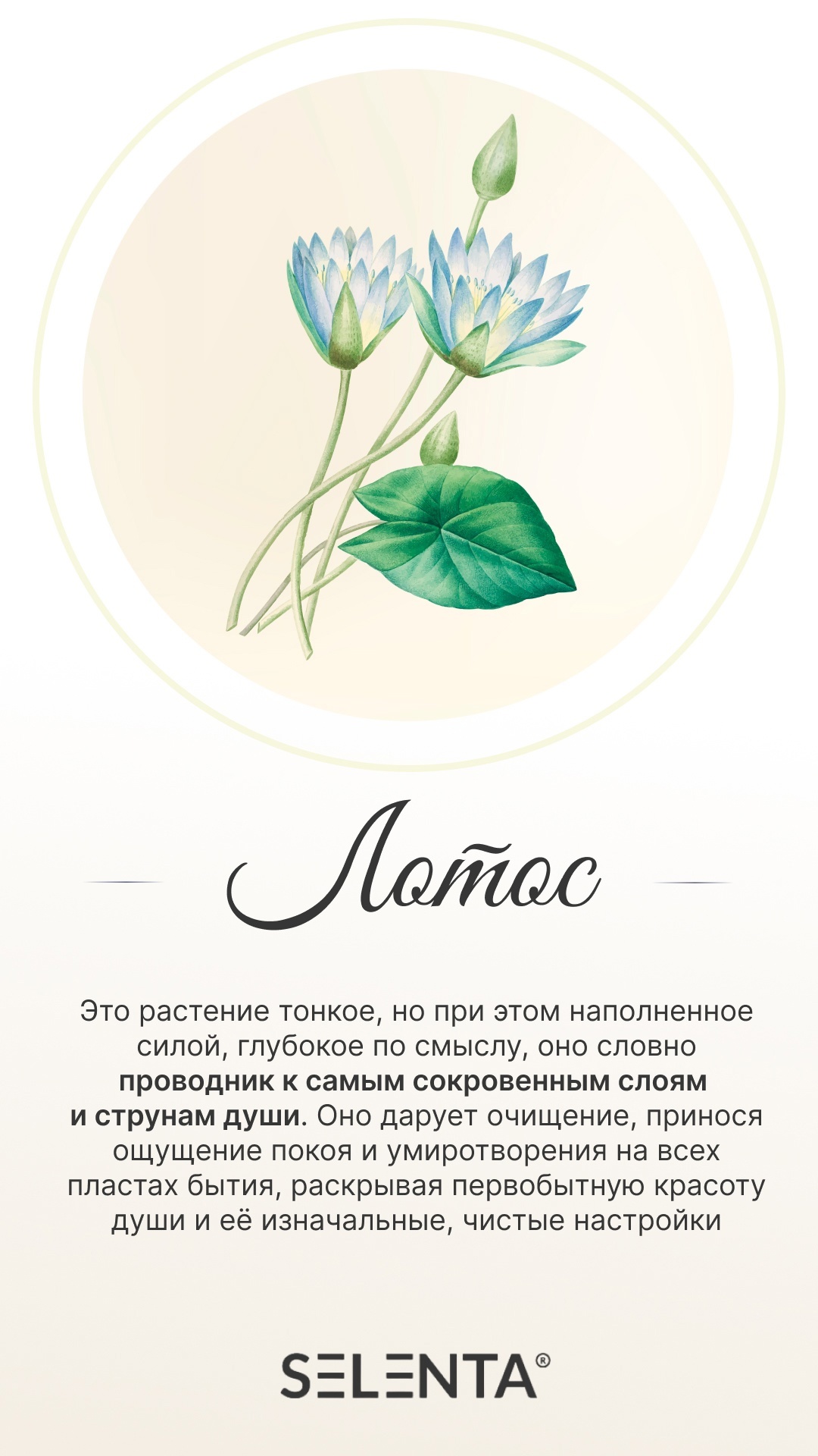 Аромат Лотоса — это символ чистоты, духовного пробуждения и внутреннего света. Его утончённый, водянистый и чуть сладкий запах помогает обрести состояние покоя, ясности и глубокого присутствия в моменте.