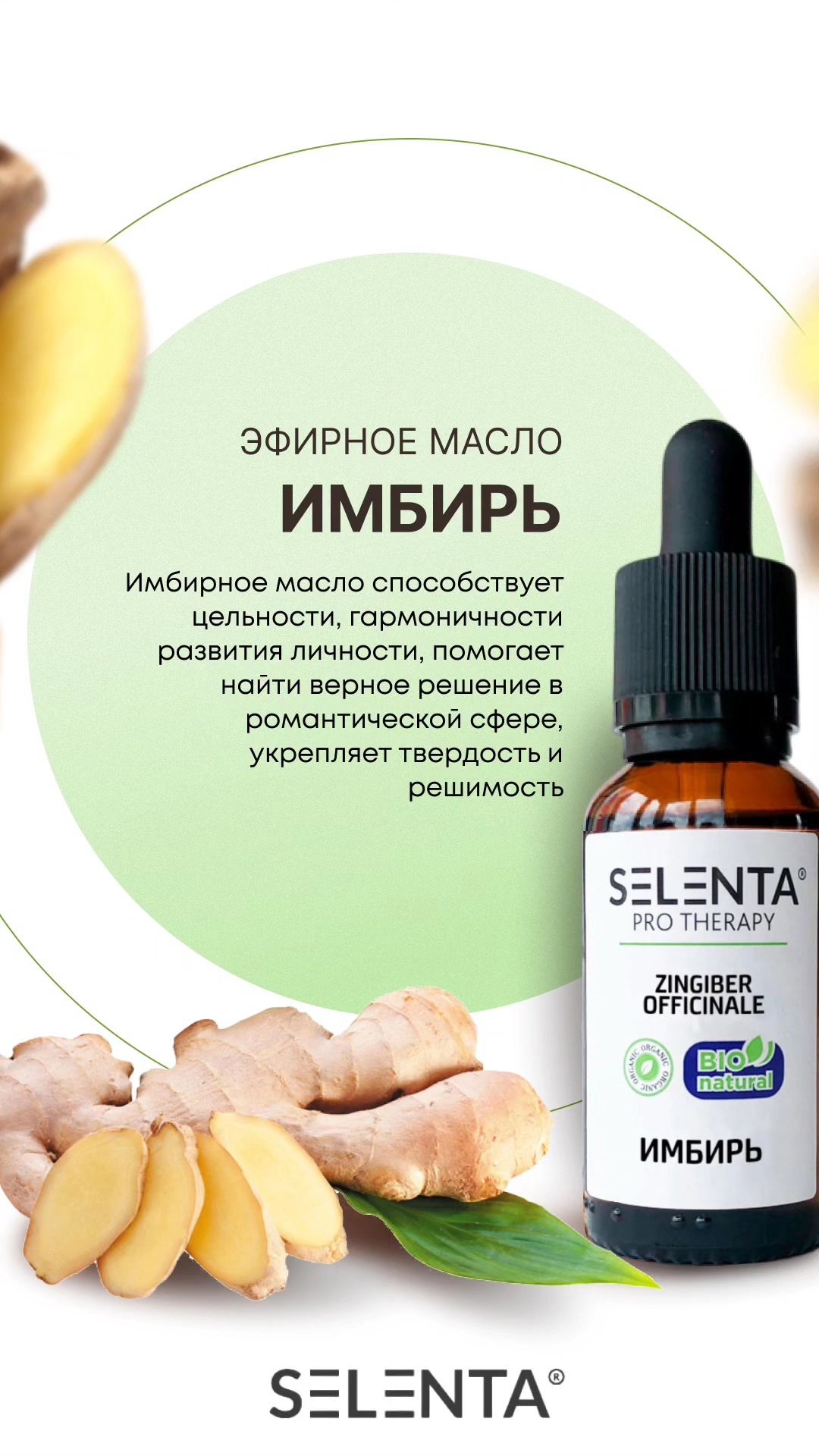 Эфирное масло Имбиря — ключ к мужскому здоровью и женской привлекательности. Обладает жиросжигающими, тонизирующими, кроветворительными, иммуностимулирующими, антисептическими, противоотечными, согревающими, увлажняющими, болеутоляющими, потогонными и мочегонными, противовирусными, противовоспалительными свойствами. Повышает самооценку, помогает заживить ранки, сократить время рассасывания даже больших гематом. Эфир включают в антицеллюлитные программы, ароматерапевтические курсы терапии нервных беспокойств и расстройств, нарушения обмена веществ. Имбирь в таком виде повышает либидо, являясь давно известным афродизиаком. С помощью масла избавляются от застоев в органах дыхания, боли в горле. Для предупреждения простуды или воспаления легких после длительного пребывания на улице в холодное время рекомендованы имбирные ванны.