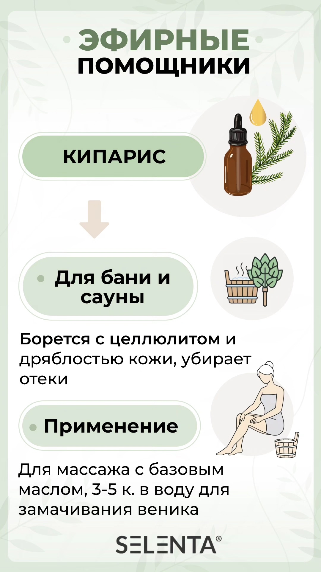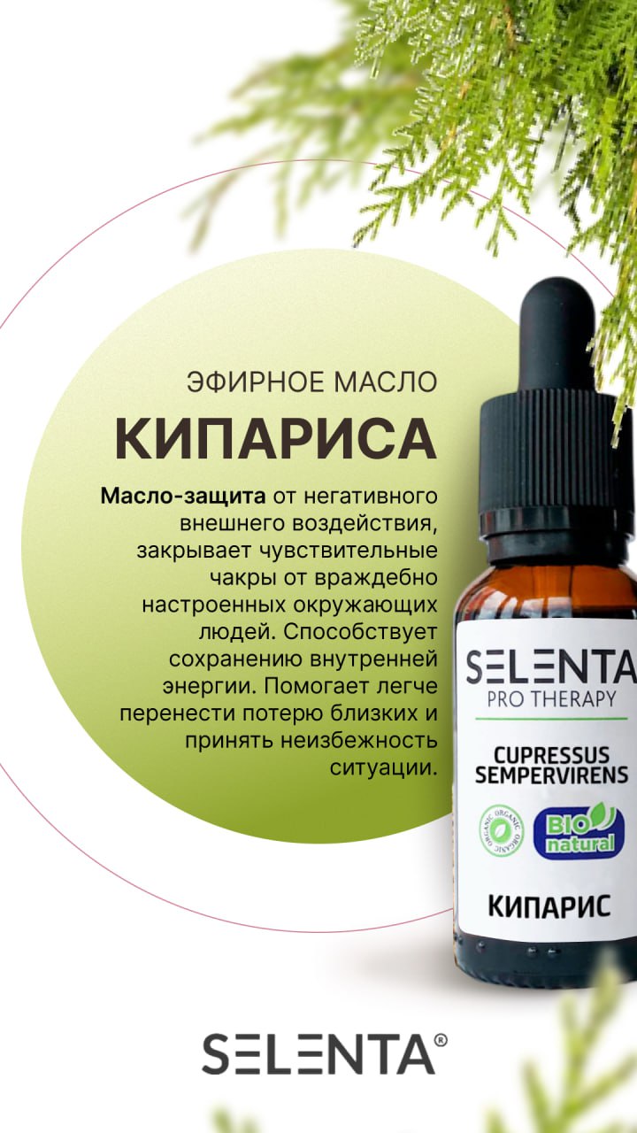Эфирное масло Кипариса — успокаивает, стимулирует принять перемены, обрести спокойствие и равновесие. Аромат Кипарисового масла очень сложный, его не так легко распознать среди группы хвойных запахов. Он представляет собой некий симбиоз тонов, близких к ароматам высокогорных хвойных и чайного дерева. Свойства эфирного масла Кипариса: антибактериальное, противокашлевое , противовирусное, иммуностимулирующее, разнозаживляющее, успокоительное, антидепрессивное. Кипарисовое масло эффективно влияет на работу кровеносной системы и помогает решить проблемы с кровяным давлением, профилактикой атеросклероза, варикозным расширением вен, кровоточивостью десен, обильным кровотечением. Косметологи рекомендуют масло кипариса для ухода как за плотной, проблемной жирной, так и за тонкой, чувствительной, сухой кожей. Так же масло применяют при целлюлите, при повышенной потливости ноги в случае появления перхоти. С заботой о вашем здоровье, Selenta!