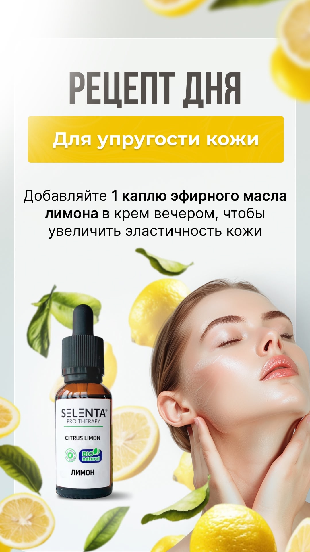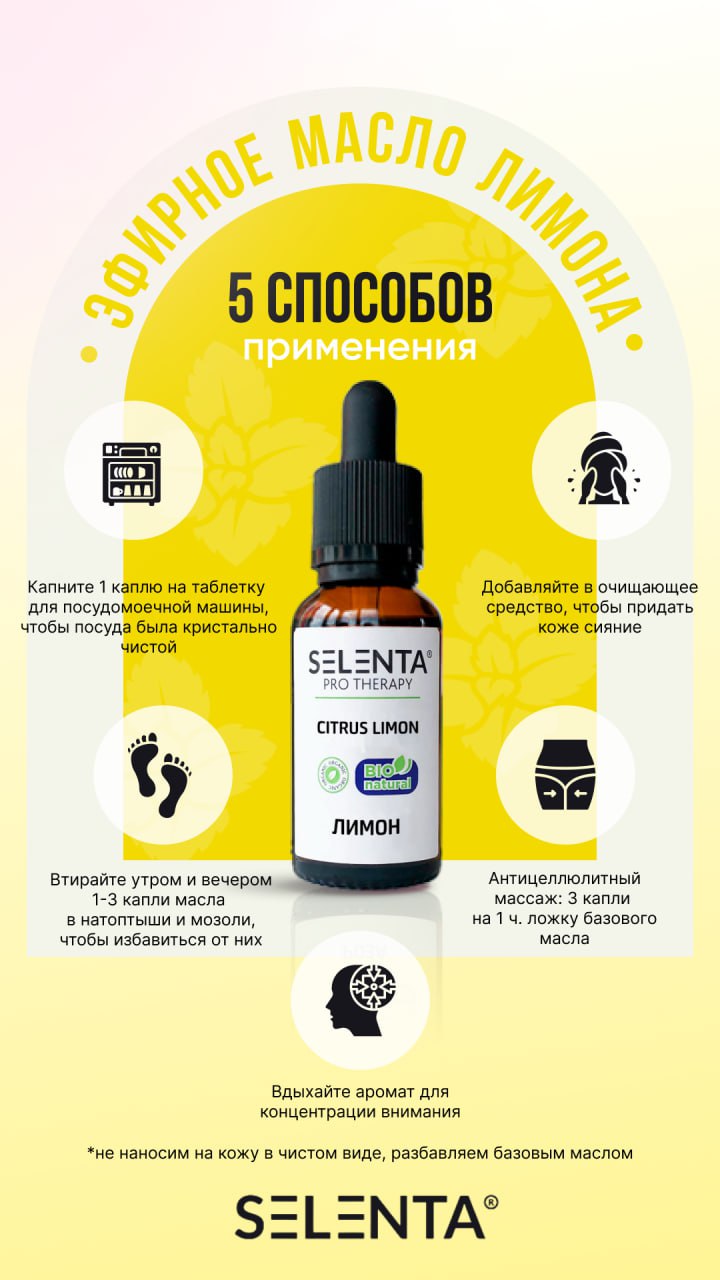 Эфирное масло Лимона применяется в косметологии и ароматерапии, для профилактики и лечения широкого спектра заболеваний. Лимон обладает антисептическими, кровоостанавливающими, разнозаживляющими, противовирусными, отбеливающими, тонизирующими, жиросжигающими свойствами. Эфирное масло благотворно воздействует на кожу, отбеливает следы от акне, препятствует образованию сальных пробок, нормализует секрецию сальных желез. Лимон уменьшает выраженность веснушек, свежих рубцов и пигментных пятен, купероза. Масло Лимона заживляет трещины, смягчает кожу (на локтях и стопах), устраняет перхоть, делает волосы и ногти ухоженными и крепкими. Применяют масло лимона при ангине, гриппе, ОРВИ, отите, ларингите, воспалении легких, насморке, назойливом кашле, ларингите, стоматите, фарингите, целлюлите, анемии, варикозном расширении вен, повышенном АД, спазмах сосудов (в т.ч. головного мозга).