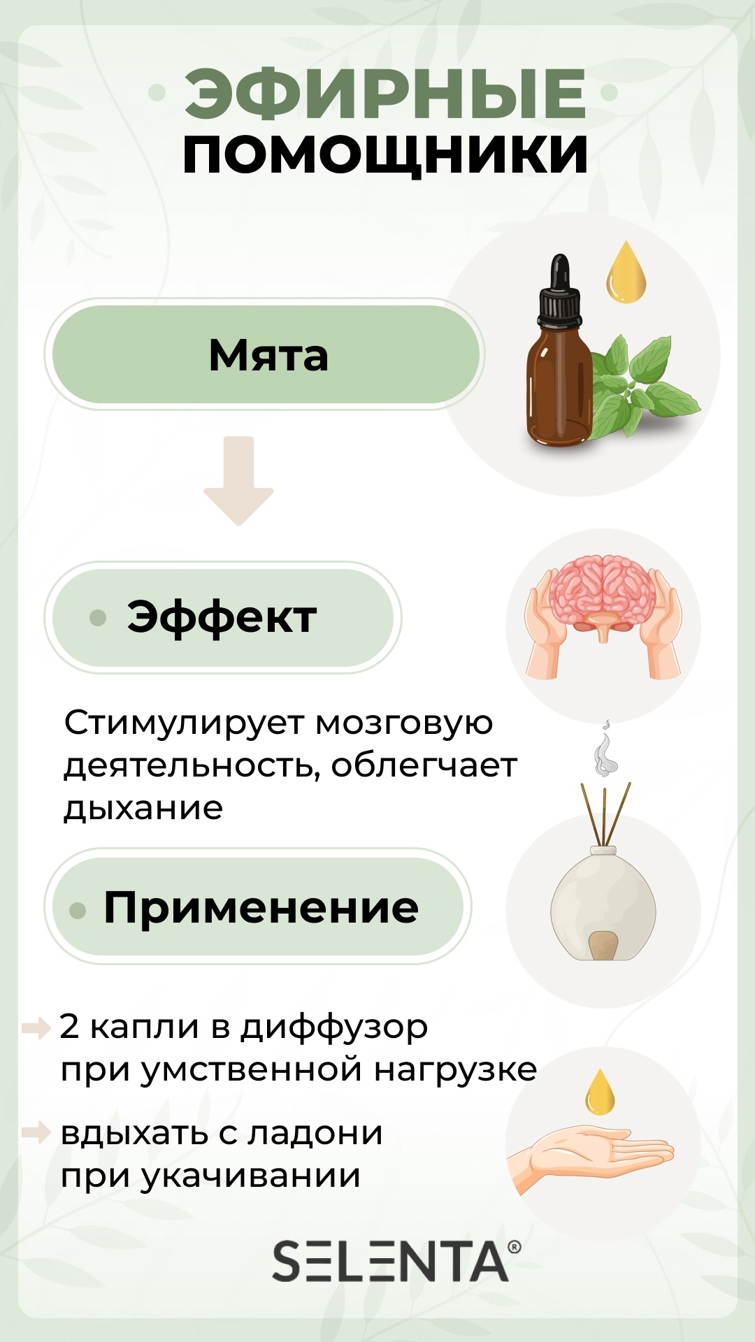 Натуральное эфирное масло переведенное в водорастворимую форму добавлением пищевого солюбилизатора. Эфирное масло Мяты в ароматерапии применяется для снятия болевого синдрома, усталости, релаксации, а также эмоционального очищения и поднятия настроения даже в самой сложной ситуации. Косметологи с помощью него успокаивают воспалённую кожу, минимизируют выработку себума, освежают и тонизируют. Мятное масло обладает освежающими, успокаивающими, противогрибковыми, тонизирующими, дезинфицирующими, противомикробными, спазмолитическими, бактерицидными, сосудорасширяющими, антисептическими, жаропонижающими, желчегонными, мочегонными, отхаркивающими свойствами. В быту используется для отпугивания комаров и мышей. Рекомендована мята в виде эфирного масла при: герпесе, укачивании, тошноте и рвоте, завоеваниях желудка, головных болях и мигренях, приступах астмы, болезненных менструациях и ПМС.