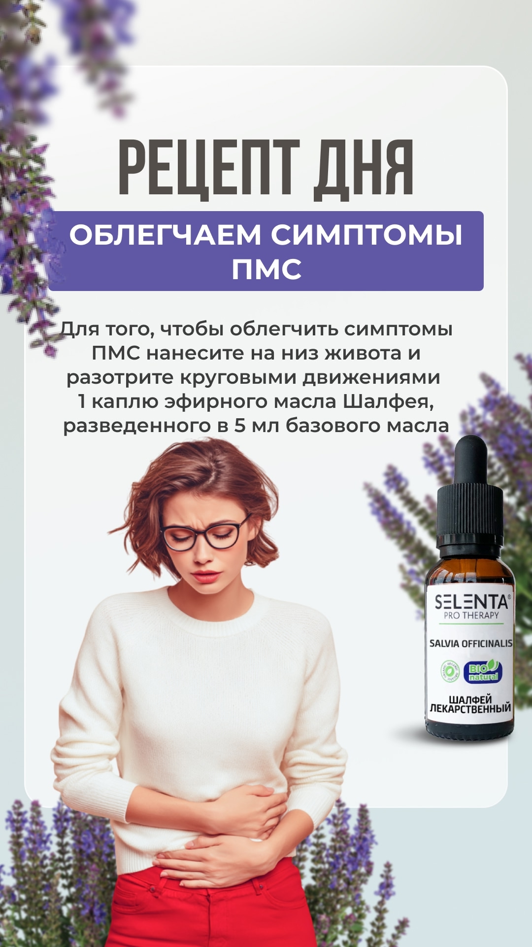 Эфирное масло Шалфея обладает восхитительным холодящим ароматом с выраженными ореховыми и горькими нотками, табачным нюансом и бальзамическим привкусом. Масло Шалфея — масло мудрости, выдержки и стабильности. Шалфей вдохновляет на продуманные решения, смелые поступки и социальный успех. Это масло обладает иммуномодулирующим, успокаивающим, антисептическим, бактерицидным, противовоспалительным, заживляющим, тонизирующим эффектами, может применяться в качестве обезболивающего и снимающего спазмы средства. Шалфей традиционно используют для лечения всех заболеваний горла и ротовой полости, в том числе и для восстановления севшего голоса. Способствует нормализации работы сердечно-сосудистой системы, повышению работоспособности — как физической, так и умственной за счет активизации деятельности центральной нервной системы. Шалфеевое масло — отличный адаптоген, гормонорегулятор. Является эффективным природным дезодорирующим средством, подходит для склонных к быстрому загрязнению волос.