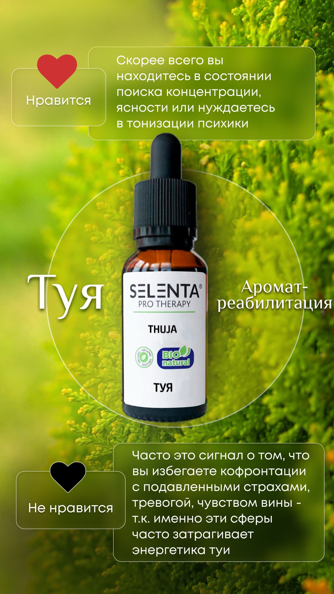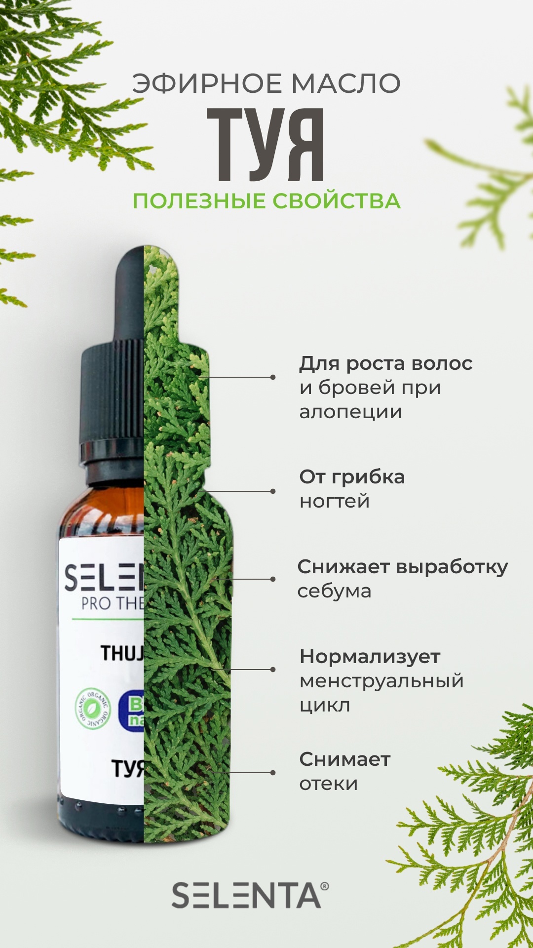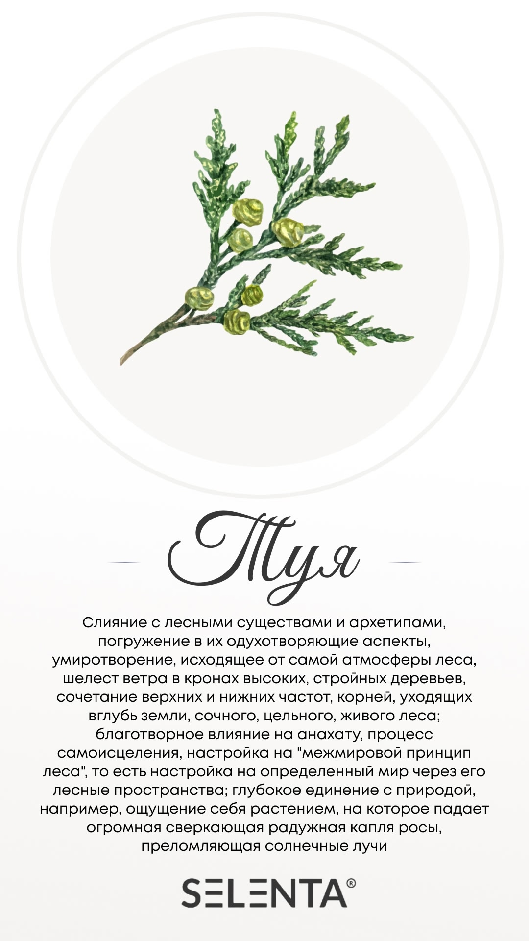 Эфирное масло Туи — одно из самых сильных тонизирующих и восстанавливающих масел, **после заболеваний и в тяжелые периоды, позволяющее прийти в себя, успокоиться и вернуться к привычному душевному состоянию**. Его аромат отгоняет усталость, предупреждает развитие стрессовых реакций, снимает депрессивные и стрессовые расстройства. Туя считается одним из лучших ароматов для достижения взаимопонимания в паре. Эфирное масло Туи обладает антисептическим, кровоостанавливающим, противоревматическим, противовоспалительным, регенерационным, противоаллергическим, тонизирующим свойствами. **Мощные регенерирующие и противовоспалительные свойства** масла Туи проявляет при всех видах проблем с кожей. Это эффективный инструмент для лечения аллергического дерматита, быстрого устранения зуда, снятия отечности, дерматитов и сыпи нервного происхождения. Считается, что эфирное масло Туи — одно из сильных средств для лечения даже застарелых растяжек. С заботой о вашем здоровье, Selenta!