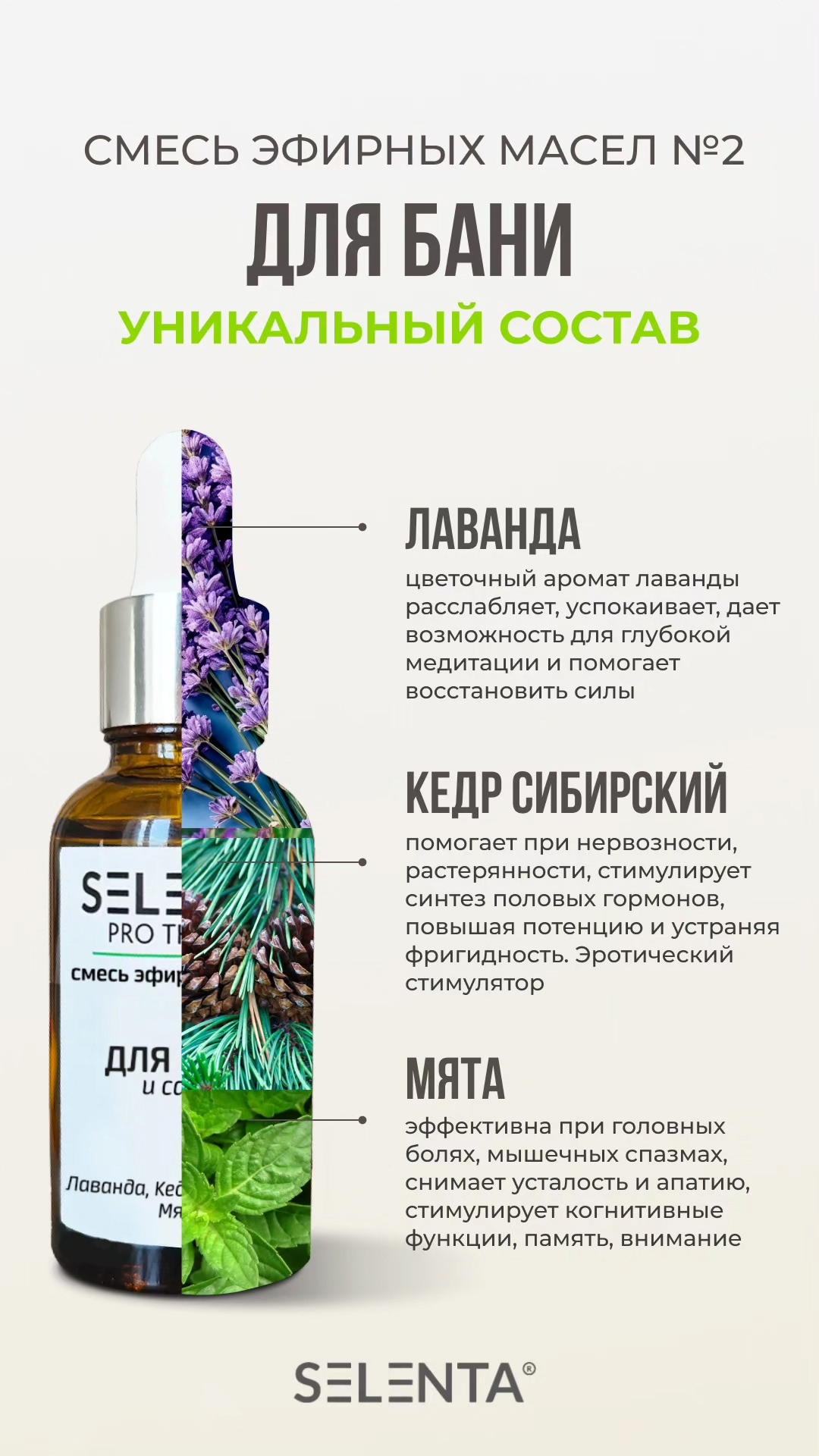 Эфирное масло Лаванды 100%; Эфирное масло Кедра Сибирского 100%; Эфирное масло Мяты 100%.