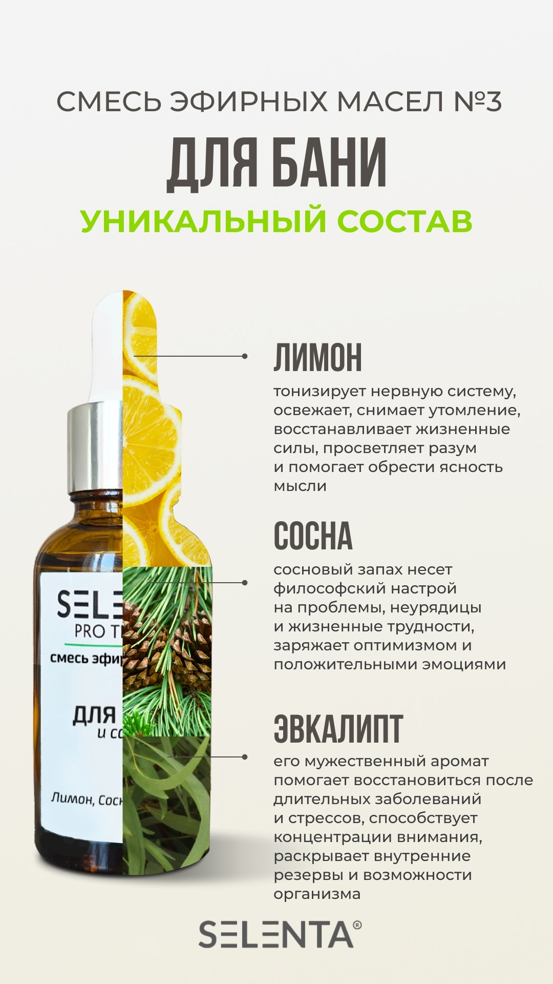 Эфирное масло Лимона 100%; Эфирное масло Сосны 100%; Эфирное масло Эвкалипта 100%.